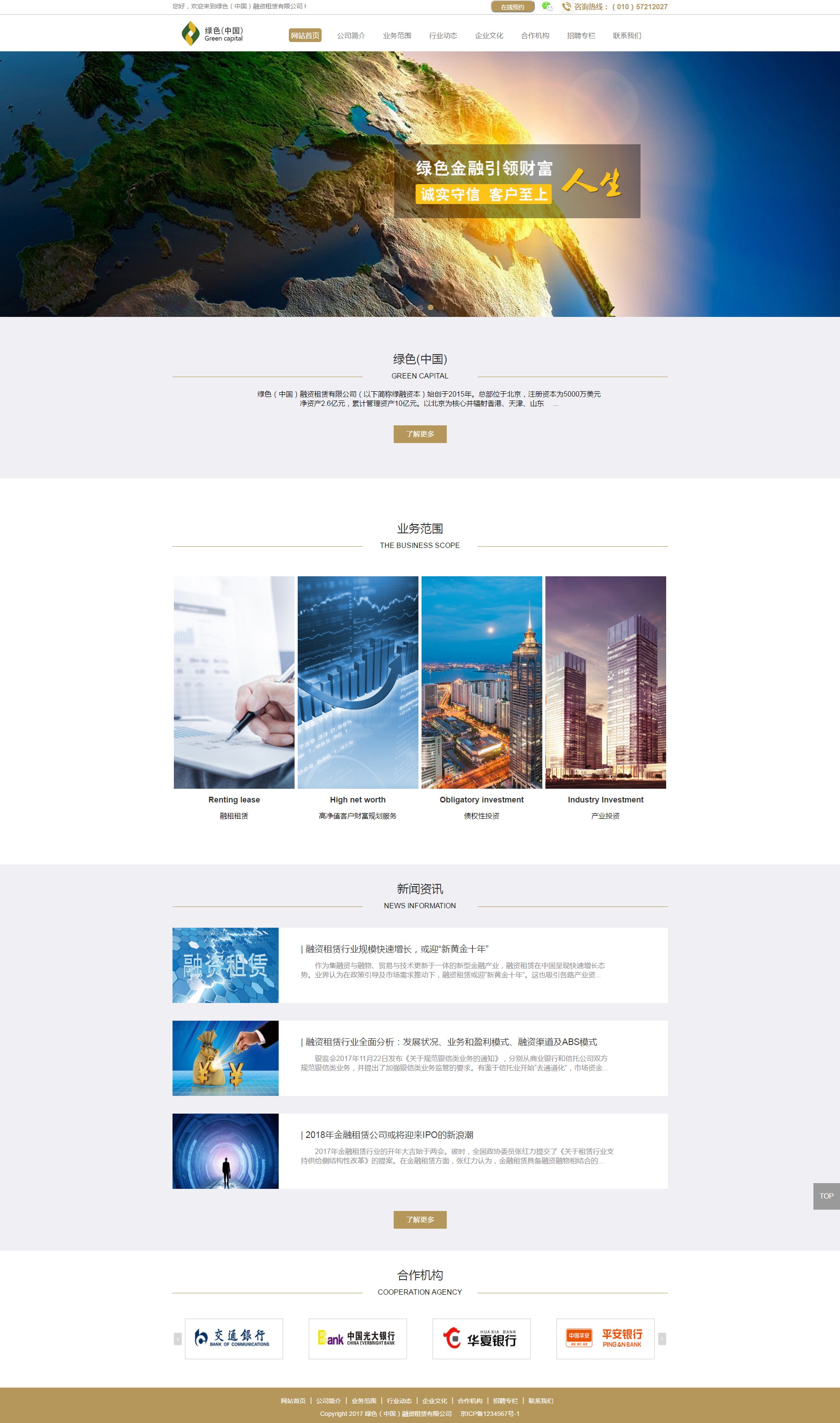 绿色(中国)融资租赁有限公司(以下简称绿融资本)始创于2015年。总部位于北京,注册资本为5000万美元,净资产2.6亿元,累计管理资产10亿元。以北京为核心并辐射香港、天津、山东、哈尔滨、西藏等区域,已为几十家企业提供综合金融服务及跨境服务,集团为投资方、融资方、第三方打造共赢价值平台,3年来,绿色中国其稳健的经营风格,一直秉承“风控第一、诚信经营、用心服务”的原则,创造“零风险”记录,获得市场一致认可。公司把融资和融物相结合,长期支持国内优质的行业龙头企业的发展,为绿色环保、养老、医药、影视、交通、旅游等行业提供了融资租赁的直租和售后回租服务,有效的支持了多家企业的健康快速发展。公司产业投资,已在制造与科技、能源与材料、金融与商业服务、消费与零售、医疗与健康等方面取得了丰富的经验与成果,建立了完善的产业投资链,以保障公司的产业投资实现资本增值收益,已经成为推动产业盘活创新升级、带动产业发展、促进产业投资和经济结构调整的积极力量,为不同阶段的客户提供财富管理、资产管理等综合性金融服务,帮助客户的资产实现稳健增长。